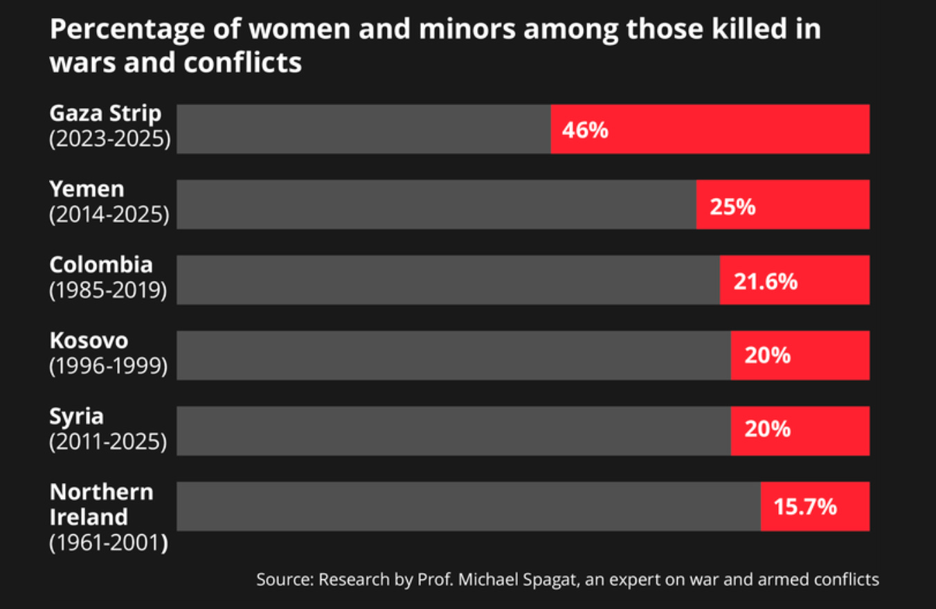 But the proportion of women and children killed is much higher compared to devastating conflicts such as Yemen and Syria.