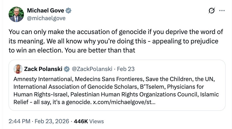 You have done this to promote the denial of Israel’s genocide against the Palestinian people. This is hardly surprising given that you served as a Cabinet minister in a Conservative government which spent nine months arming and facilitating that genocide.