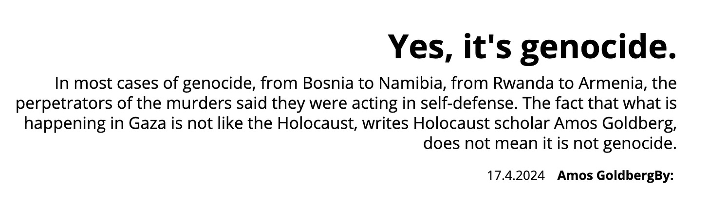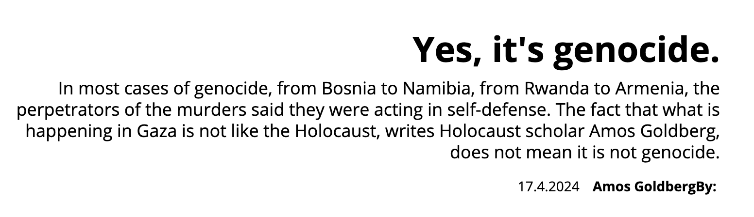 Michael: Do you believe that Professor Amos Goldberg is depriving the word ‘genocide’ of meaning and only making the accusation to appeal to prejudice against his own people, the Jewish people?