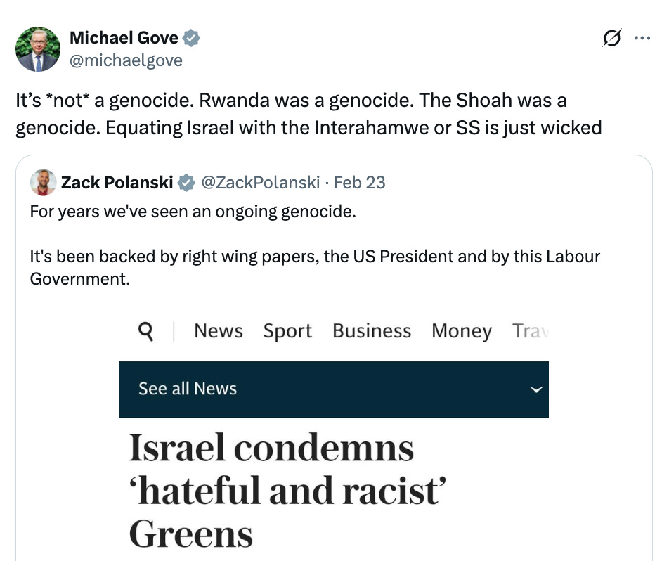 Thank you Owen Jones. What a devastating critique of Gove's cruel and stupid remarks. So, Gove, is the Israeli action in Gaza a genocide? I think you must answer this question. It is not a trivial matter, not a chance remark thrown out in a lazy moment, to be discarded with a laugh. We are talking about the most extreme of murders, the extermination of a people on purpose by a civilized country. Germany was a civilized country too, throughout the Holocaust. Can you not say it? What's the matter with you?