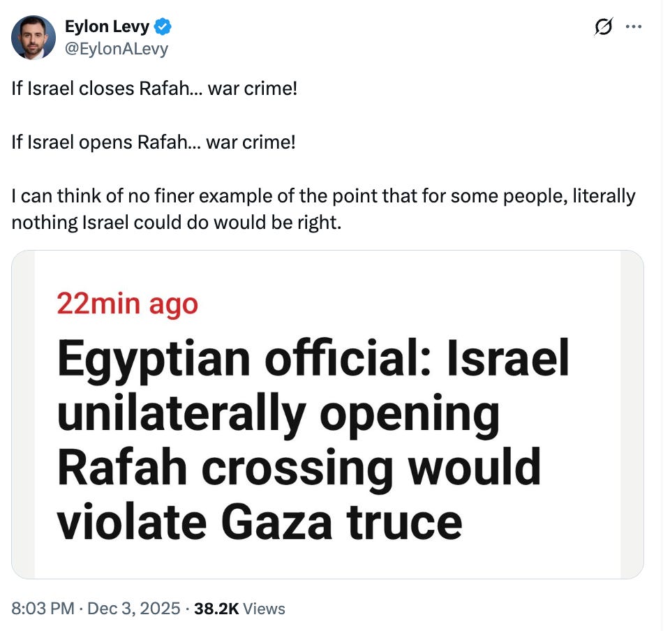 Eylon Levy, the British-Israeli propagandist and indeed former spokesperson to Benjamin Netanyahu, a wanted man due to the International Criminal Court’s arrest warrant for war crimes and crimes against humanity, posts in response to the Egyptian position: