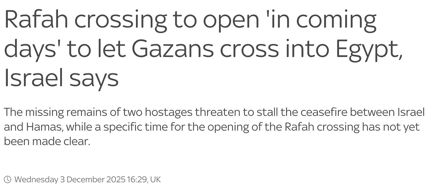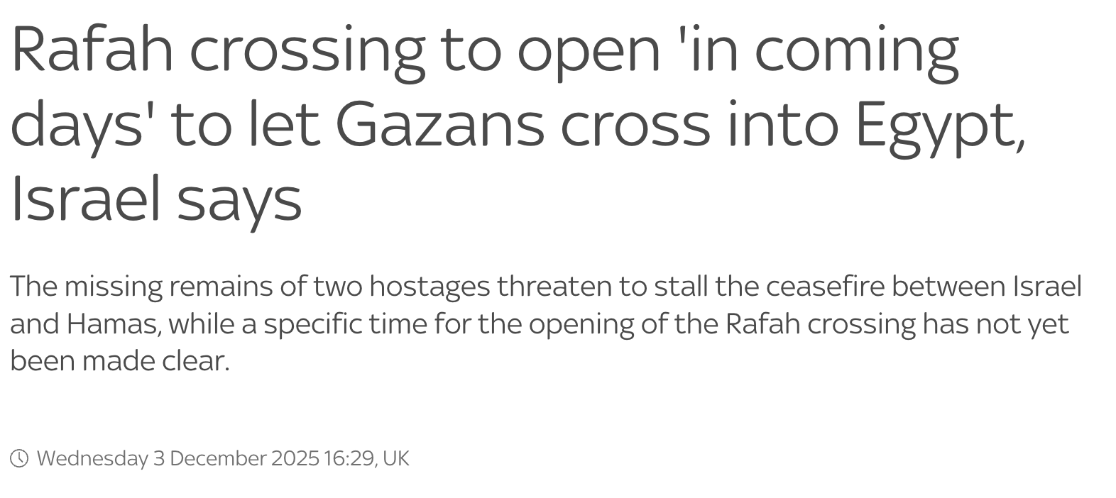 Let’s start with Israel’s repeatedly stated plan to empty Gaza of its Palestinian population. Sky News has published an article headlined ‘Rafah crossing to open ‘in coming days’ to let Gazans cross into Egypt, Israel says’