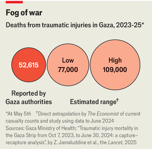 The Economist - which supported Israel’s genocidal onslaught - offered an estimate of only violent deaths, which was much higher than the official figure. Back then, the Health Ministry reported 52,615 deaths - but the range offered by The Economist was a low of 77,000 and a high of 109,000 deaths. This is out of date data - it stops at 5th May 2025.