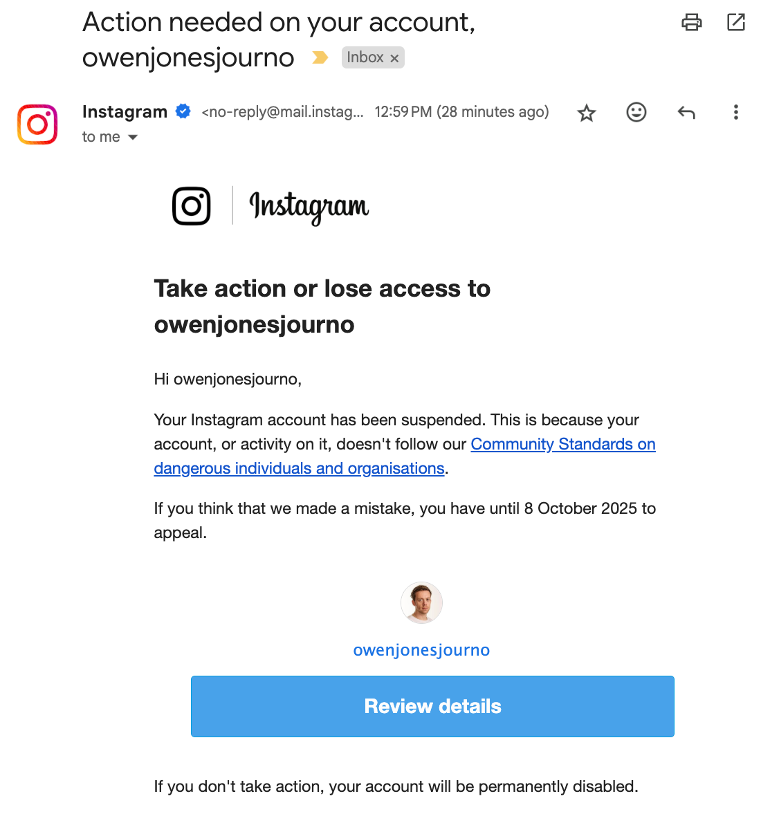 Early this afternoon, I discovered that my Instagram profile had been suspended. That means not only can I not access it, my profile - instagram.com/owenjonesjourno - is no longer visible.
