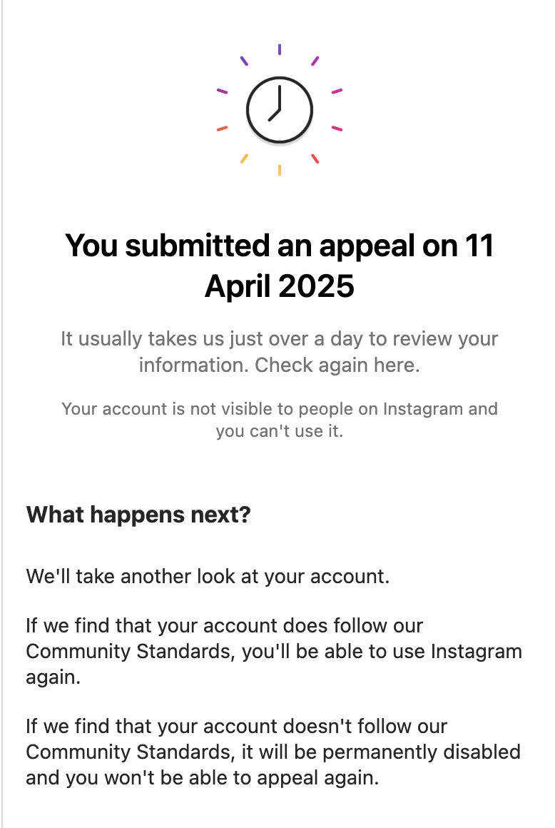 Having submitted an appeal, Instagram informed me that if they look into it and conclude I’ve violated these Community Standards, then my account will be permanently erased.