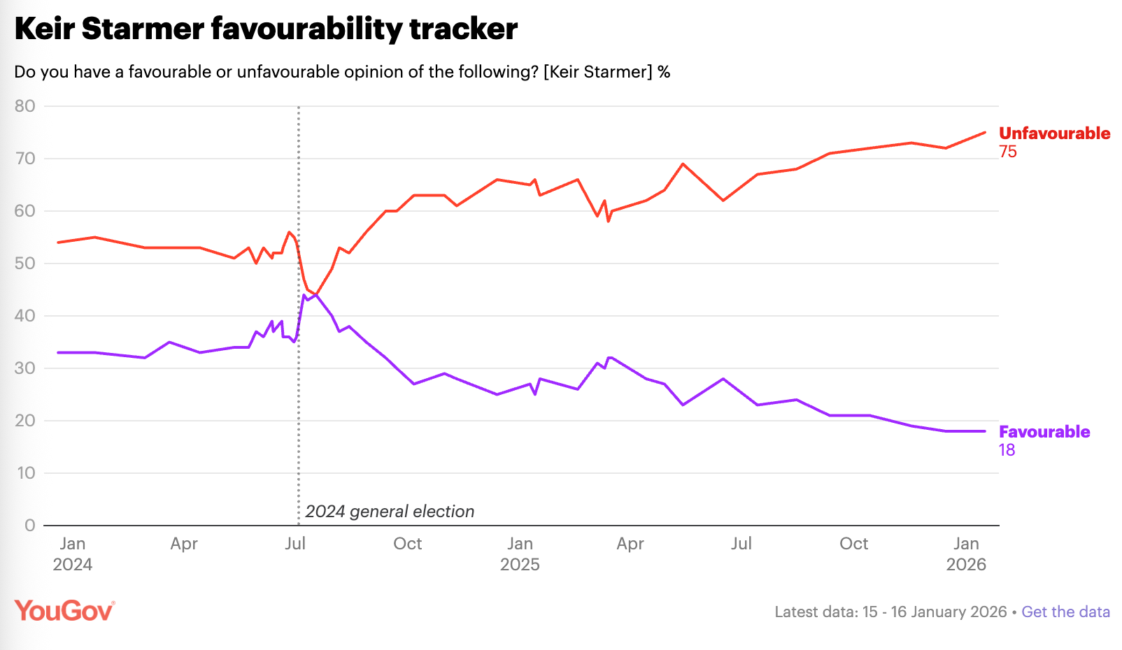 A bit of context. According to YouGov, 75% of voters have an unfavourable view of Keir Starmer, compared to 18% who have a favourable view. That gives him a net favourability rating of minus 57.