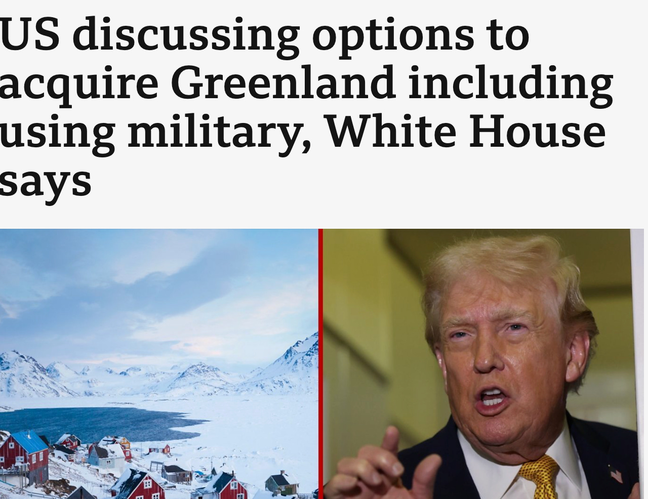 As for the ‘US Greenland plans’ standfirst: euphemistic doesn’t even begin to describe it. They’re talking about it like it’s, I don’t know, government plans for transport or education. We use the word ‘plans’ for things like going on holiday, or spending time with friends and loved ones at the weekend.