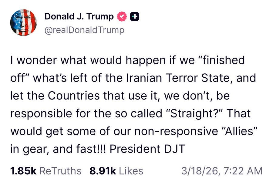 The problem here is that Trump cannot just “declare victory and go home”, because Iran can continue to inflict further economic damage which the US will suffer from. If the US withdrew in those circumstances, it would simply be read - correctly - as a catastrophic defeat US power could not recover from.
