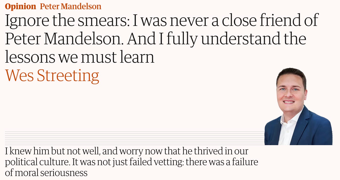 As part of the inquiry into this shitshow, ministers are obliged to hand over their correspondence with Mandelson, which is then to be made public. So Wes Streeting has now released his text messages and WhatsApps with Mandelson and published a Guardian column about it - and that column is quite something.