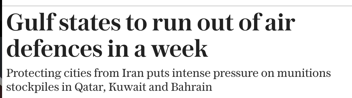 This article notes that many - but not all - Iranian ballistic missiles and drones have been intercepted but that’s only by burning through munitions stockpiles in Qatar, Kuwait and Bahrain.