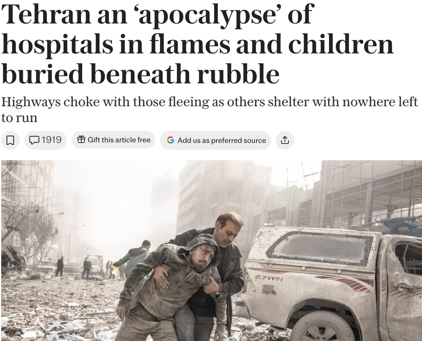 It’s notable that the BBC is quoting residents in Tehran describing their horror at the US-Israeli attacks, saying things like: “Not happy anymore [at the possibility of regime change], no. Just tired. And confused as to what might happen.”